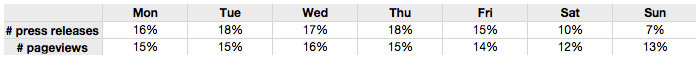 Keep this in mind: pageviews have nothing to do with the day press releases get published. On the other hand, it can be interesting to compare the rates: when the press releases are published and when you get the most pageviews.